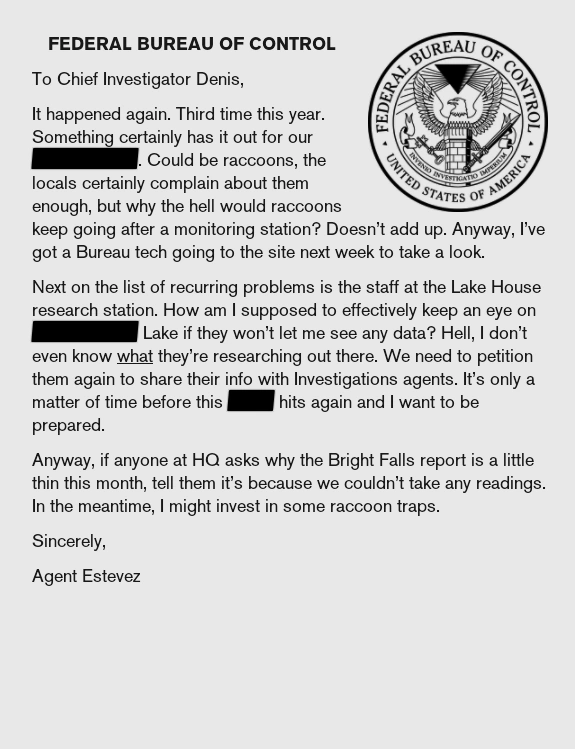 Next on the list of recurring problems is the staff at the Lake House research station. How am I supposed to effectively keep an eye on [REDACTED] Lake if they won't let me see any data? Hell, I don't even know what they're researching out there. We need to petition them again to share their info with Investigations agents. It's only a matter of time before this [REDACTED] hits again and I want to be prepared.