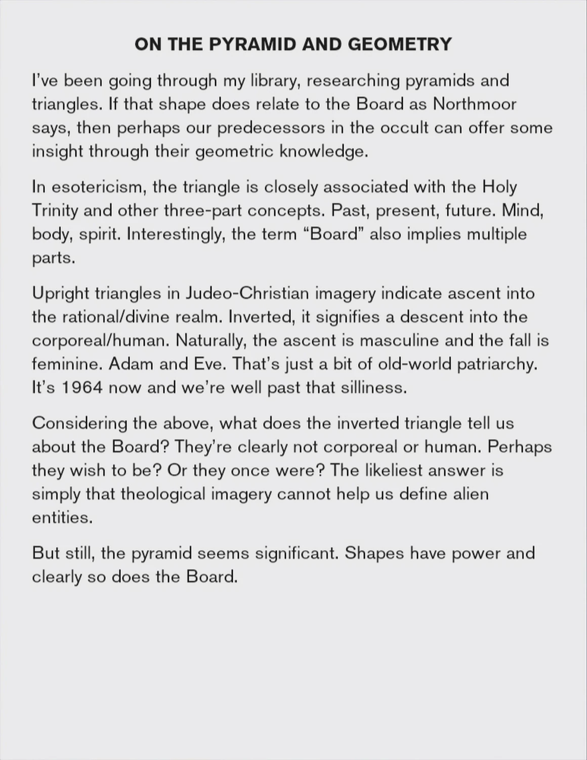 I’ve been going through my library, researching pyramids and triangles. If that shape does relate to The Board as Northmoor says, then perhaps our predecessors in the occult can offer some insight through their geometric knowledge.