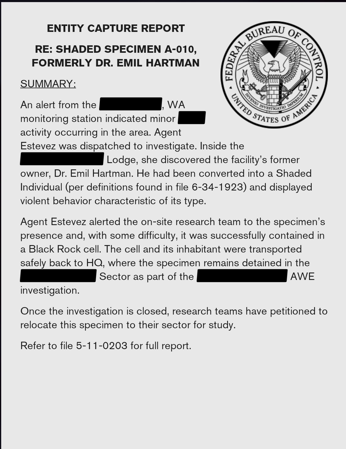 An alert from the [REDACTED], WA monitoring station indicated minor [REDACTED] activity occurring in the area. Agent Estevez was dispatched to investigate. Inside the [REDACTED] Lodge, she discovered the facility's former owner, Dr. Emil Hartman. He had been converted into a Shaded Individual (per definitions found in file 6-34-1923) and displayed violent behavior characteristic of its type.